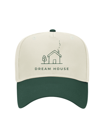 Adam Doleac embroidered "Dream House" Hat on a Natural/Dark Green Golf Snapback. "Adam Doleac" is embroidered around the back hat opening.